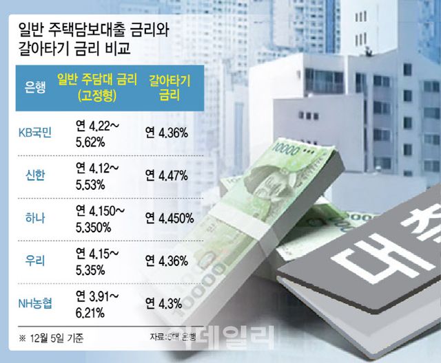 7일 은행권에 따르면 시중은행들은 일반 주택담보대출 금리보다 대환용 금리를 더 비싸게 받고 있다. KB국민은행의 경우 지난 5일 기준 고정형 주담대 금리가 연 4.22~5.62%인 반면, 대환 금리는 연 4.36%로 하단과 비교하면 더 높다. 같은 날 신한은행의 갈아타기 금리는 연 4.47%로 일반 주담대 금리(4.12~5.53) 하단보다 0.35%포인트 높다. 하나은행 갈아타기 금리(5년 고정)도 연 4.450%로 일반 주담대 금리(연 4.150~5.350%) 하단에 비해 0.3%포인트 높은 상황이다. 우리은행은 주담대 금리가 연 4.15~5.35%지만 갈아타기 금리는 연 4.36% 수준이다. NH농협은행의 경우에도 일반 주담대 금리는 연 3.91~6.21%, 갈아타기 금리는 하단보다 0.39%포인트 높은 연 4.3%다. 이뿐만 아니라 KB국민은행은 지난달 22일부터는 아예 대환 대출을 막아놨고, 하나은행도 같은 달 11일부터 전세대출 갈아타기를 중단했다가 이달 5일부터 비수도권에 한해 재개한 상태다.