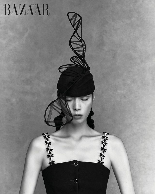 ‘레이어드 디자이어스(Layered Desires)’ 밀리너리 아트워크는 Shinjeo. 슬리브리스 톱은 Chanel.