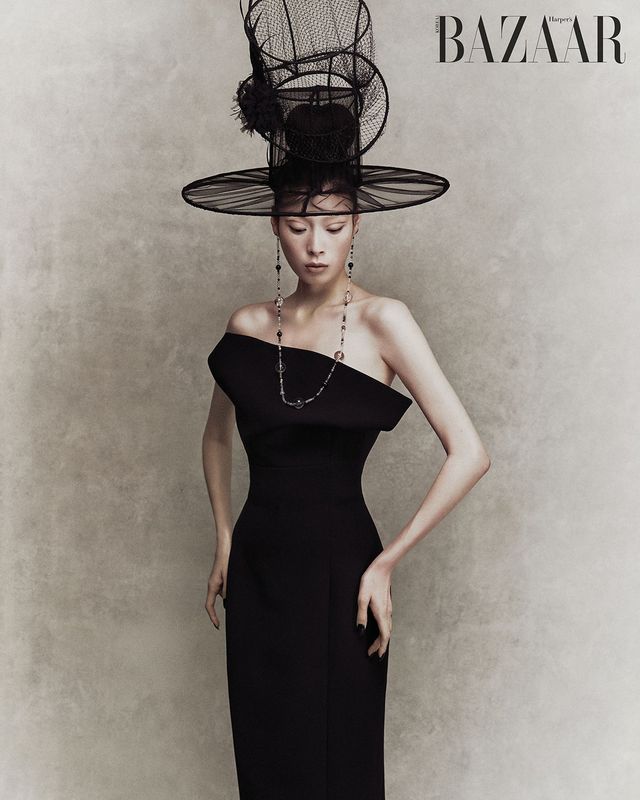 와이어 프레임에 튤을 덧댄 갓, 그 위에 얹은 베일 커버 톱햇은 Q Millinery. 언밸런스 튜브톱 드레스는 6백70만원대 Khaite.