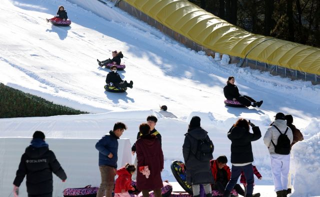 노원 눈썰매장에서 가족들이 눈썰매를 타며 즐거운 시간을 보내고 있다 / 뉴스1