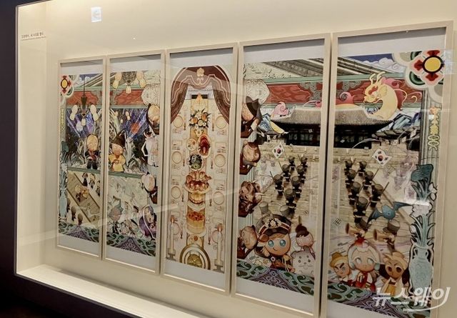 쿠키런 IP를 활용해 재해석한 다섯 폭 병풍 형식의 '쿠키런 상상화 2: 칭경예식, 새 시대를 열다' 작품. 사진=김세현 기자
