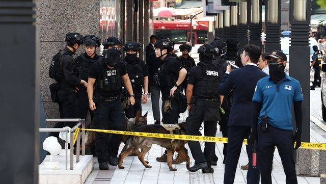 지난 8월 5일 오후 서울 신세계백화점 본점에서 한 인터넷 커뮤니티에 해당 백화점 내부에 폭발물을 설치했다는 협박글이 올라와 경찰특공대 등이 현장에 출동해 조사 중인 모습 / 뉴스1