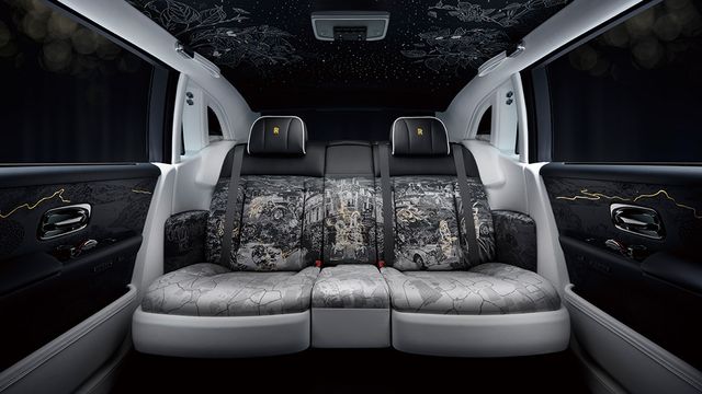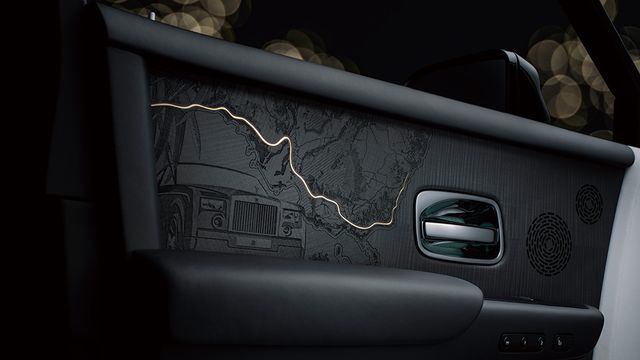 진정한 경이로움은 차량 내부에서 펼쳐졌다. 앞좌석 가죽에는 레이저 에칭 기법으로 두 가지 모티브가 새겨져 있다. ‘Seagull’(시걸)과 ‘Roger Rabbit’(로저 래빗). 각각 1923년형과 2003년형 팬텀의 프로토타입 코드명이다. 이처럼 차 곳곳에 숨겨진 상징을 발견하는 과정은 정교한 보물찾기처럼 지적 즐거움을 선사한다. 이번 컬렉션의 압권은 뒷좌석이었다. 패션 아틀리에와 12개월에 걸쳐 공동 개발한 특수 패브릭에는 팬텀의 역사를 관통하는 풍경과 차량이 프린트되어 있고, 그 위에 일곱 명의 상징적 오너를 표현한 자수를 더했다. 45개 조각으로 분할된 패브릭은 런던 새빌로(Savile Row) 맞춤 양복 봉제 기법을 참고해 입체적으로 재봉했다. 디자이너 셀리나 메탕(Celina Mettang)은 “오너가 일상적으로 차를 타면서 서서히 발견해가는 디테일의 재미를 남겨두고 싶었다”고 설명했다. 실제로 뒷좌석 하단에는 비틀스의 존 레논이 소유했던 사이키델릭 팬텀 V가 섬세하게 숨겨져 있었다. 이 차량은 1967년, 레논이 영국 예술가 그룹 ‘더 풀(The Fool)’에 의뢰해 사이키델릭 페인팅을 입히며 전설이 된 모델이다. 천장을 올려다보면 또 다른 세계가 펼쳐진다. 헨리 로이스 경의 삶에서 영감을 얻은 뽕나무 잎과 새, 입체적 꿀벌 자수가 조화롭게 배치되어 있다. 꿀벌은 롤스로이스 양봉장을, 새는 레이싱 드라이버 맬컴 캠벨이 속도 기록에 도전한 ‘블루 버드(Blue Bird)’호를 상징한다. 이 문양들 사이로 반짝이는 LED 별빛은 지중해의 밤하늘을 그대로 옮겨놓은 듯하다. 도어 패널에는 팬텀이 걸어온 여정이 입체적 지도로 표현되어 있다. 헨리 로이스 경이 겨울을 보낸 프랑스 남부의 해안선, 여름을 나던 웨스트 위터링의 평온한 풍경, 한 오너가 굿우드에서 차량을 인수해 호주 퍼스까지 7200km를 달린 실화까지. 이 모든 여정을 두께 0.05mm의 24K 금박을 정밀하게 잘라내 숙련된 장인이 손으로 하나하나 끼워 넣은 것이다. 제작하는 데 4만 시간이 소요됐다는 설명이 결코 과장이 아님을 실감할 수 있는 대목이다.