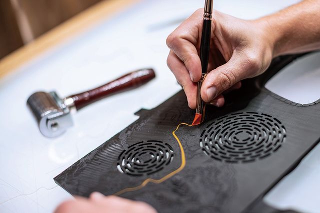 3D 잉크 레이어링과 마케트리, 금박 리핑을 결합한 새로운 목공예 기술로 완성한 우드 패널.