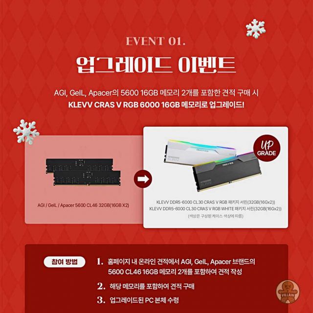 서린씨앤아이가 운영하는 서린컴퓨터가 연말 맞이 DDR5 메모리 업그레이드 프로모션을 시행한다. 온라인 견적에서 AGI·GeIL·Apacer DDR5-5600 CL46 16GB×2 구성으로 PC를 구매하면 KLEVV CRAS V RGB DDR5-6000 CL30 패키지로 무상 업그레이드된다. CRAS V RGB는 고클럭·저지연·XMP 3.0/EXPO 지원과 RGB 연동 기능을 제공하는 상위 라인업이다. 소식 공유 이벤트도 병행되며, 추첨자에게 기프티콘을 지급한다. 수량 소진 시 종료된다.