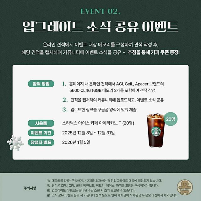 업그레이드는 메모리 2개 구성에 한하며 PC 조립 필수 6대 구성품(CPU, CPU 쿨러, 메인보드, 메모리, 케이스, 파워)이 포함된 주문 건이어야 한다. 준비된 물량이 소진되면 행사는 조기 종료된다.