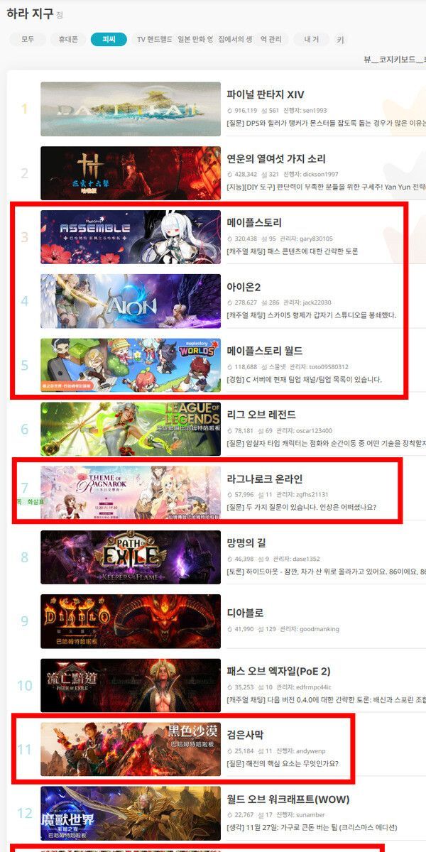 12월 9일 바하무트 순위를 보면, 한국 게임들이 두각을 나타내고 있다. 특히 엔씨소프트의 아이온2는 PC 게임 카테고리에서 4위를 기록하며 높은 포럼 활동도를 보이고 있다. 메이플스토리 필드와 라그나로크 온라인도 상위권에 랭크되며 대만 유저들의 활발한 토론이 이어지고 있다.
