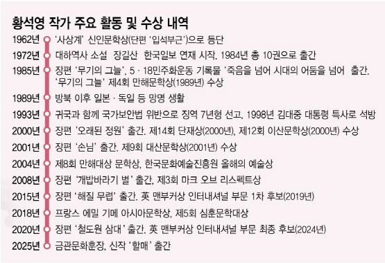 1943년 중국 지린성 창춘에서 태어난 황 작가는 한국 문단을 대표하는 작가로 평가받는다. 대표작으로는 군부독재 시절 사랑과 저항의 시간을 그린 ‘오래된 정원’, 한국전쟁의 비극과 집단 기억의 상처를 정면으로 파고든 ‘손님’ 등이 있다.