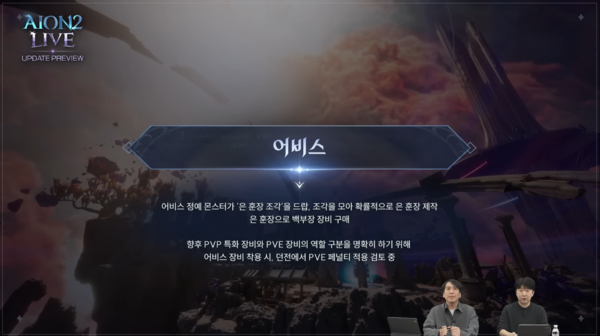향후 업데이트 계획으로는 크로스 서버 거래소 ‘월드 거래소’가 추가되며, 필드 및 어비스 보스 리스폰 타임 조정, 17일·24일 원정 어려움 모드 도입 등이 이뤄진다. 특히, 어비스는 정예 몬스터가 백부장 장비 구매에 요구되는 ‘은 훈장 조각’을 드롭하게 되며, 차기 시즌 PvP 특화 장비와 PvE 장비 역할 구분을 위해 어비스 장비 던전 페널티 부여 여부를 검토 중인 상황이다.