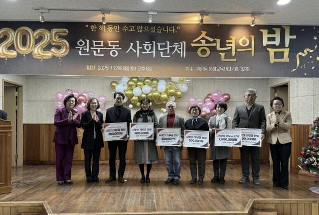 이날 송년회에서는 원문동 부녀회가 100만 원, 통장단·주민자치위원회·체육회가 각 30만 원, 지역사회보장협의체·새마을지도자협회가 각 20만 원을 기부해, 총 230만 원이 어려운 이웃을 돕는 데 사용되도록 원문동 지역사회보장협의체에 전달됐다.