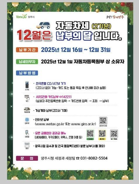 납부 기한은 12월 31일까지이며, 납세자는 가까운 금융기관과 우체국, 읍면동 행정복지센터, 양주시청을 방문해 납부하거나 ARS, 위택스, 인터넷지로, 가상계좌 및 지방세입계좌 이체, 카카오페이, 네이버페이, ATM·CD기 등 다양한 방법으로 편리하게 납부할 수 있다. 납부 마감일에는 금융기관 혼잡과 접속 지연이 발생할 수 있어 미리 납부할 것을 당부하고 있으며, 납기 이후 납부할 경우 3퍼센트의 납부지연가산세가 부과된다.