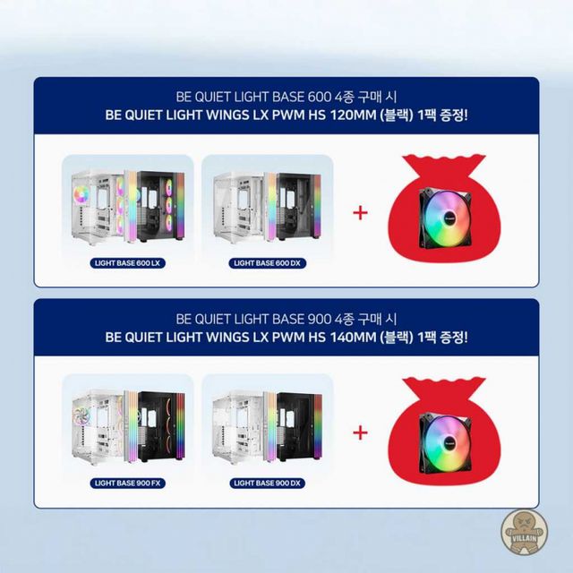 LIGHT BASE 600 모델을 선택한 경우 ARGB 기반 LIGHT WINGS LX PWM HS 120mm 1팩이 제공된다. LIGHT BASE 900 구매 고객에게는 동일 시리즈의 140mm 규격 팬이 지급된다. SILENT BASE 802 구매 시에는 고풍압 설계가 적용된 PURE WINGS 3 140mm PWM 1팩이 포함되며, DARK BASE 701 구매 고객에게는 프리미엄 팬 라인업인 SILENT WINGS 4 120mm PWM 1팩이 제공된다. 팬의 색상은 케이스 색상 및 행사 구성에 따라 자동 배정된다.