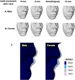 분석 결과, 여성은 남성보다 치아 이동량에 비례하여 더 광범위하고 뚜렷한 연조직 변화를 보였다(P<0.05). 특히 입술 및 뺨 부위의 후방 이동 및 볼륨 감소가 여성에게서 두드러지게 나타났다. 이는 여성의 연조직이 교정 치료에 더 반응성이 높음을 시사한다. </p>