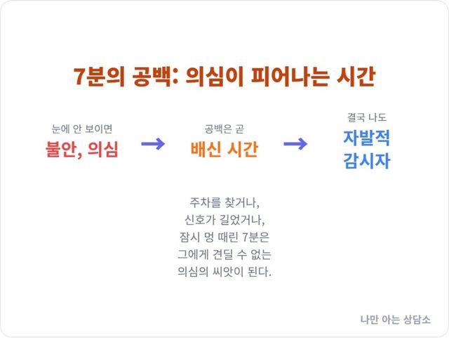 7분의 오차. 누군가에게는 주차 자리를 찾느라 지하 3층까지 내려간 시간일 수 있다. 신호가 유난히 길었거나, 잠시 멍하니 좋아하는 노래를 끝까지 들었던 시간일 수도 있다. 하지만 통제광들에게 이 공백은 견딜 수 없는 의심의 씨앗이다.