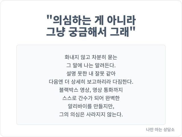 더욱 끔찍한 것은 이 모든 과정이 ‘대화’의 형식을 빌려 이루어진다는 점이다. 그들은 화를 내거나 소리를 지르지 않는다. 아주 차분하고 논리적인 척 묻는다. “아니, 의심하는 게 아니라 그냥 궁금해서 그래. 길이 막혔으면 막혔다고 말을 해주면 되잖아.”