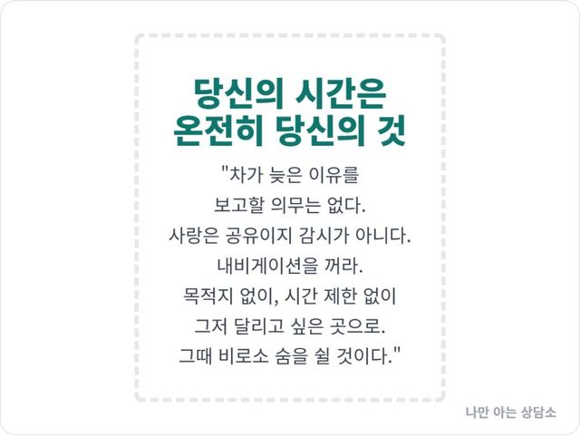 당신에게는 설명하지 않을 권리가 있다. 차가 왜 늦었는지, 5분 동안 무엇을 했는지 일일이 보고하지 않아도 될 자유가 있다. 그 짧은 공백은 당신의 사생활이며, 침범할 수 없는 고유의 영역이다.