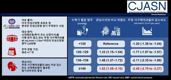 연구 결과 수축기 혈압이 140㎜Hg 이상인 환자는 120㎜Hg 미만인 환자 대비 신장 기능 악화 위험이 약 1.82배 높았고 약 5년간 추적 관찰한 결과 신장 기능 감소 속도도 약 2배 빨랐다.
