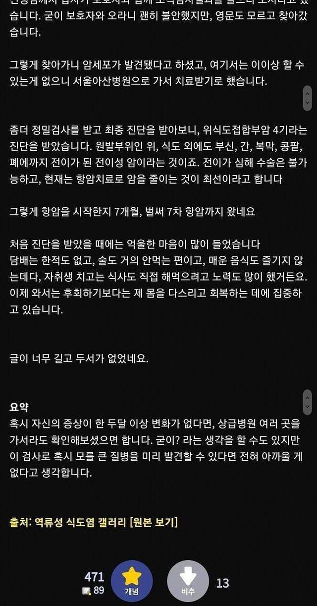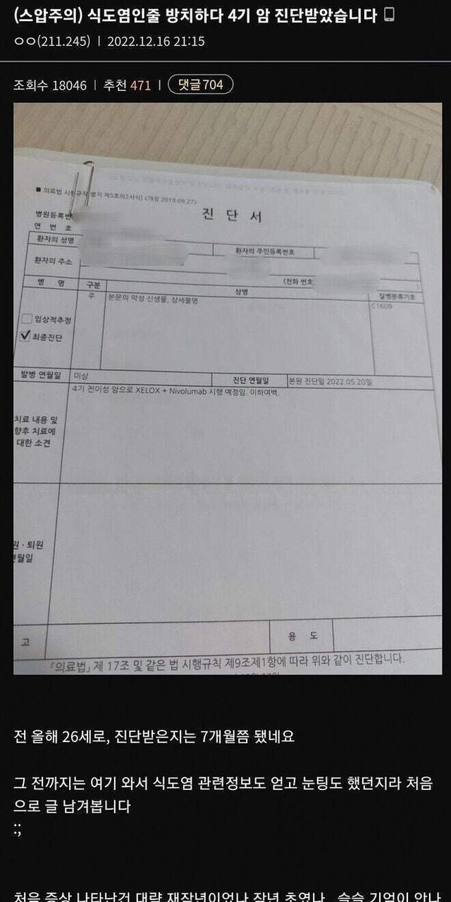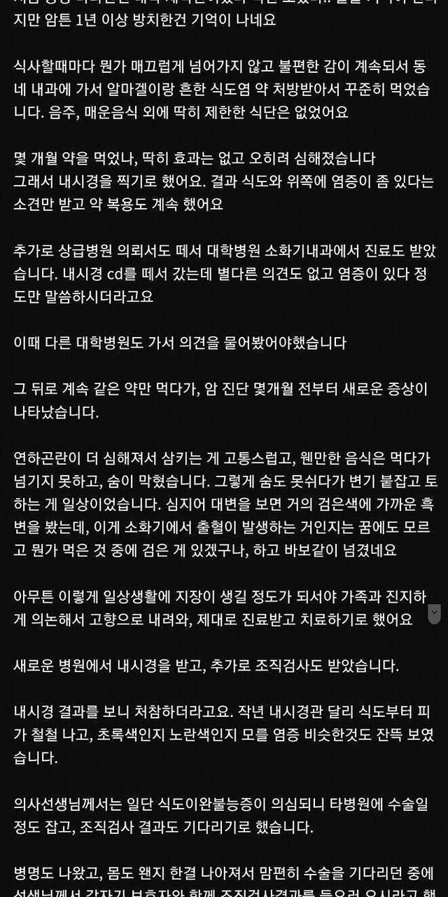 식도염인 줄 방치하다 4기 암 진단 받았다는 사람