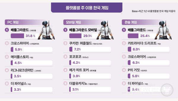 해외 게임 시장에서 배틀그라운드(PUBG)의 독주가 확인됐다. 문화체육관광부와 한국콘텐츠진흥원(Korea Creative Content Agency, 이하 콘진원)이 11일 발표한 '2025 해외 시장의 한국 게임 이용자 조사'에 따르면, 조사 대상 10개국 대부분에서 배틀그라운드 시리즈가 최상위 이용 게임으로 집계됐다.