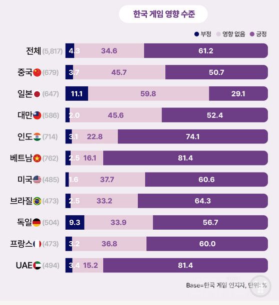 이번 조사는 게임 주요 수출 지역 10개국에 거주하는 외국인 중 최근 1년 이내 한국 게임 이용자 1만 명을 대상으로 진행됐다. 해외 이용자의 과반(58.2%)이 자신이 이용 중인 게임을 한국 게임으로 인지하고 있으며, 이들 중 61.2%는 한국산이라는 점이 게임 선택에 긍정적으로 작용했다고 답했다.