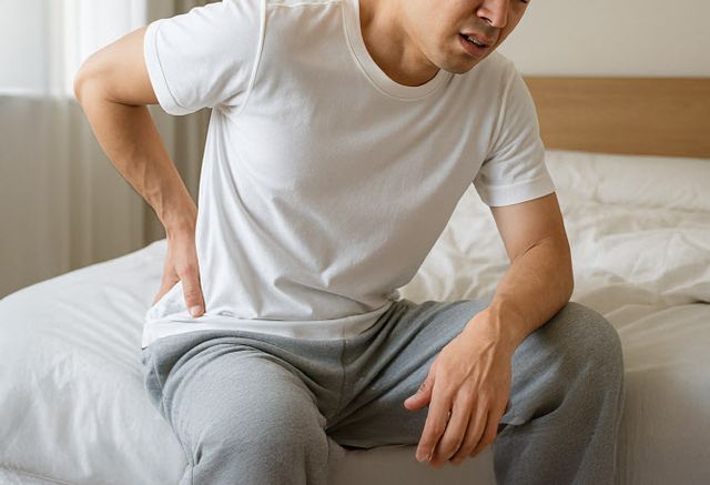 강직성 척추염의 통증은 일반적인 허리디스크나 근육성 요통과는 다른 양상을 보인다. 일반적인 요통은 활동량이 많을 때 악화되고 휴식을 취하면 호전되는 경우가 많지만, 강직성 척추염은 움직이면서 증상이 완화되고 아침에 통증과 뻣뻣함이 가장 심한 것이 특징이다. 통증이 허리뿐 아니라 엉덩이와 골반 깊은 부위에서 시작되는 경우도 흔하다. 또한 일부 환자에서는 포도막염으로 인한 눈 충혈과 시력 불편, 발뒤꿈치나 아킬레스건 부위 통증, 말초 관절 통증, 장 증상 등이 동반될 수 있어 단순 요통과의 감별이 필요하다.