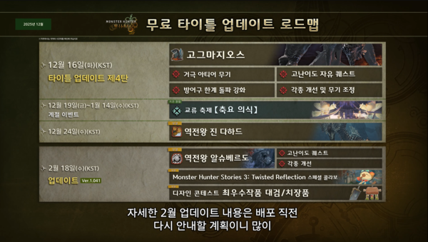 한편, 오는 12월 16일 배포되는 4차 타이틀 업데이트는 ‘몬스터 헌터 와일즈’의 마지막 대형 업데이트로, 이후로는 스팀 안정성 개선 패치, 2월 역전왕 추가 등 최종 업데이트가 진행될 예정이다.