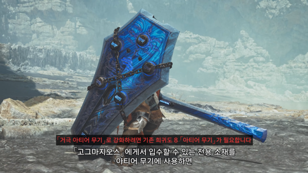 고그마지오스는 헌터 4인과 NPC 서포트 헌터 4인까지 총 8명이 도전하는 특수 퀘스트로 등장한다. 고그마지오스 소재로는 방어구 외에도 희귀도8 아티어 무기를 활용한 ‘거극 아티어 무기’를 제작할 수 있다.
