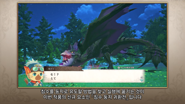 먼저, ‘몬스터 헌터 스토리즈3’는 신규 트레일러와 함께 신작의 다양한 신규 시스템 정보를 전했다. 작중 ‘침수 몬스터’는 다른 몬스터의 생태 구역을 빼앗고 둥지를 트는 강력한 개체로 표현된다. 침수의 둥지에서 ‘멸종 위기종’의 알을 발견할 수 있다. ‘리와일딩’ 시스템은 멸종 위기 몬스터를 생태에 돌려보낼 수 있는 시스템으로, 리와일딩에 따라 개별 구역의 ‘생태 랭크’가 변화한다.
