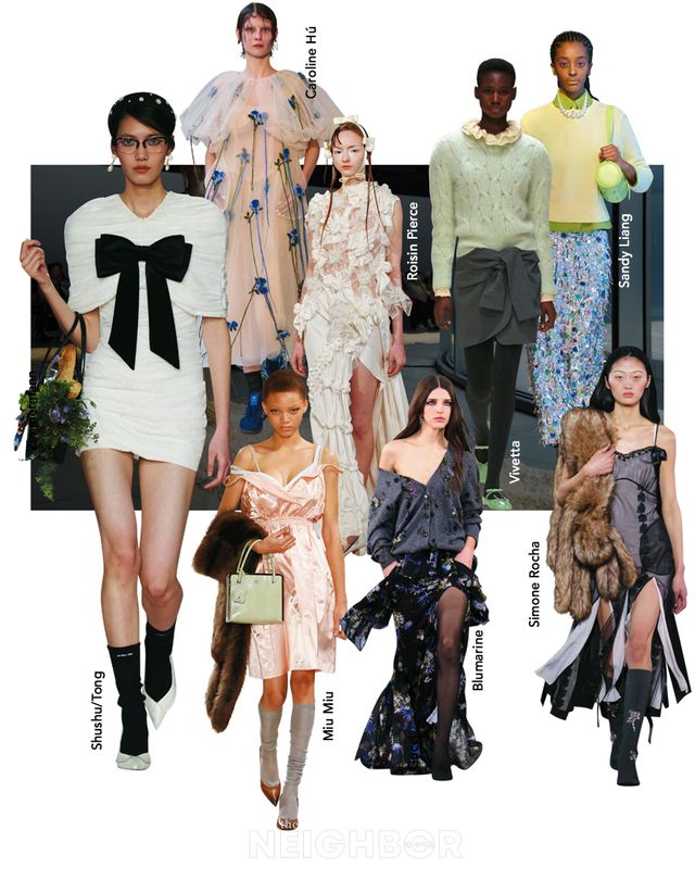 미우미우, 샌디 리앙, 세실리에 반센…. 좋아하는 브랜드를 나열해 보면 단번에 에디터의 취향을 간파할 수 있을 것이다. 이름만 들어도 스타일이 단번에 그려지는 확신의 걸리시 무드를 전개하는 이 하우스들은 연말 시즌 더욱 빛을 발한다. 리본, 러플, 플라워 같은 로맨틱 디테일은 파티 룩에 빠질 수 없는 필수 요소이기 때문. 데일리로는 다소 과하게 느껴지던 아이템도 모두가 화려해지는 페스티브 시즌엔 오히려 과감하게 즐길 수 있다. 친구들과 크리스마스 분위기를 가득 담은 연말 파티를 계획 중이라면, 시몬 로샤와 미우미우가 런웨이에서 선보인 것처럼 집에서 막 걸어 나온 듯한 슬립 드레스에 큼지막한 퍼 스카프를 무심히 걸쳐보자. 한층 가녀린 실루엣을 연출하며 사랑스러운 동시에 쿨한 매력을 드러낼 테니.