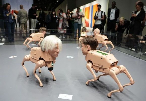 전시에 나온 로봇에는 일론 머스크 테슬라 CEO, 제프 베이조스 아마존 창업자, 마크 저커버그 메타 CEO 등 테크 재벌은 물론 앤디 워홀과 파블로 피카소 등 미술사 거장들의 얼굴이 사용됐다. 또 김정은과 작가 본인의 얼굴을 본뜬 로봇개도 등장했다.