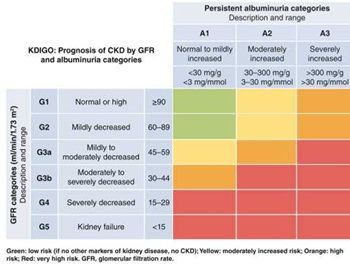 한편 만성신장병은 3개월 이상 만성적으로 신장의 구조적 또는 기능적 이상이 확인되는 경우로, 추정사구체여과율과 알부민뇨 정도에 따라 분류된다.
