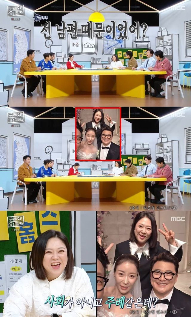 중국 임장에 갔으나 윤정수 결혼식 참석을 위해 힘든 일정을 소화했다는 김숙과 결혼식 사진을 본 박나래는 "결혼식 이야기 좀 해달라. 분명 세 분이서 찍은 사진 보면 주례 같다. 어떻게 된 거냐"고 너스레를 떨었다.