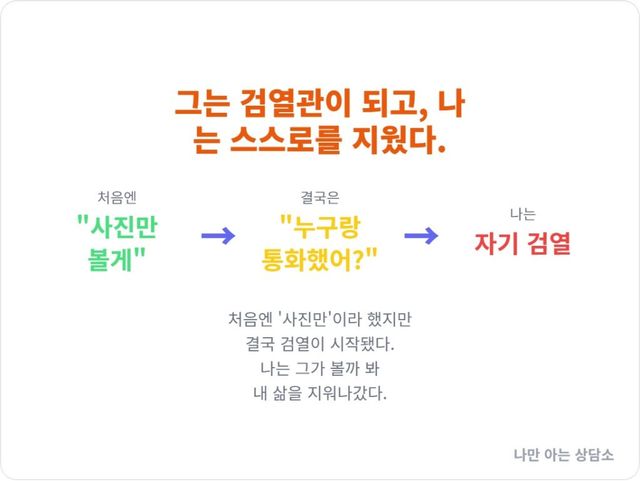 비밀번호가 공유된 직후부터, ‘검열’은 시작된다. 처음에는 “사진만 볼게”라고 말했을 것이다. 하지만 갤러리를 보다가 실수인 척 카카오톡을 누르고, 문자 메시지 함을 훑어보고, 통화 기록을 스크롤 한다.