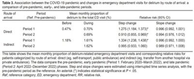 (표)코로나19 전·초기·후기 기간별 섬망 환자의 응급실 내원 경로별 변화량 비교 (연구논문 발췌)