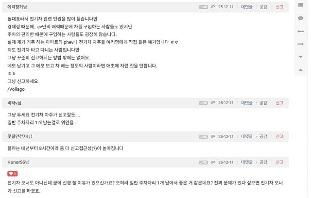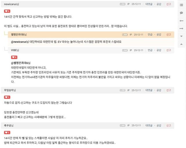 때문에 전기차 오너들은 “단지에 아무 데도 주차할 자리가 없다면 전기차 충전구역에 밤중에 주차하는 건 허용해줘야 한다”라는 입장이다. 반면 내연기관차 오너들은 “원래 충전하지 않을 때 충전구역에 차량을 세우는 건 불법”이라며 신고해야 한다고 반박한다.