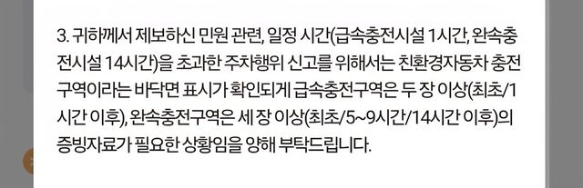 문제는 전기차 충전 구역의 비충전 주차를 신고하려고 해도 요건이 지나치게 까다롭다는 것이다. 현행 규정은 연속 14시간 동안 동일 구역에 주차돼 있음을 3장의 사진으로 증명해야 한다.