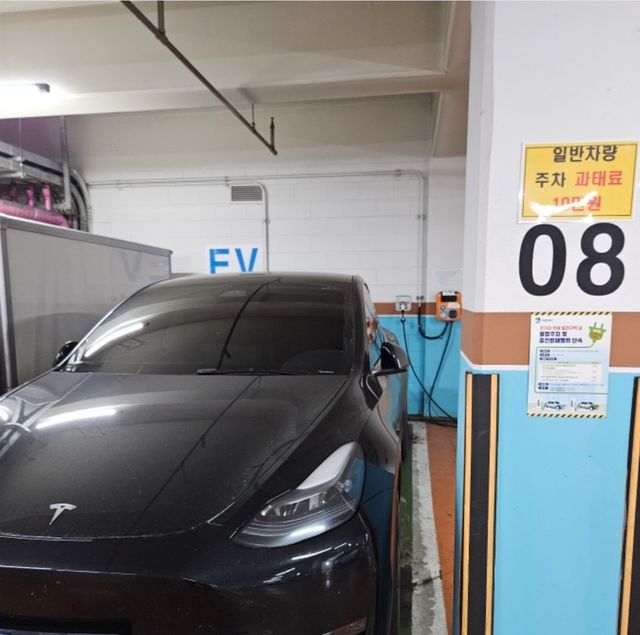 | ▲ 아파트 전기차 충전 구역에 주차된 테슬라 모델 3 <출처=클리앙> |