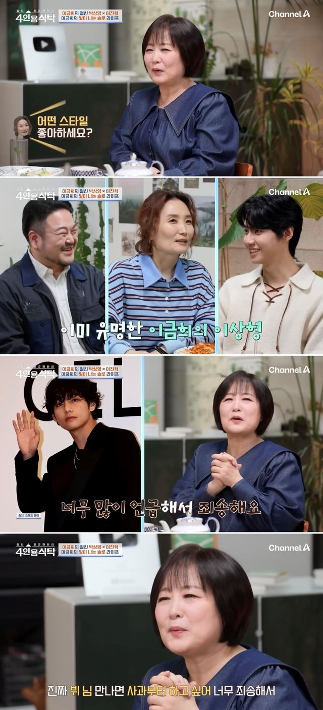 이금희의 ‘뷔 사랑’은 여러 방송에서 이어지고 있다. 8일 방송된 채널A ‘절친 토큐멘터리–4인용 식탁’에서도 마찬가지였다. 싱글 라이프와 연애, 이상형 이야기가 나오자 그는 “잘생긴 남자요. 뷔… 너무 죄송해요. 제가 너무 많이 언급해서 얼마나 불편하시겠어요”라며 웃었다. 이어 “만나면 사과 먼저 하고 싶다”고 전했다. 박경림이 “사과하려면 일단 만나야죠?”라고 재치 있게 받자, 그는 활짝 웃으며 “그러니까! 만나야 사과하지. 너무 죄송합니다”라고 답했다.