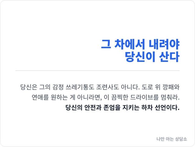 운전 습관은 고쳐지는 것이 아니다. 옆에서 당신이 사탕을 입에 넣어주고, 좋은 음악을 틀어주며 ‘인간 내비게이션’ 역할을 자처한다고 해서 그의 본질이 바뀌지는 않는다. 당신은 그의 감정 쓰레기통도 아니고, 조련사도 아니다.