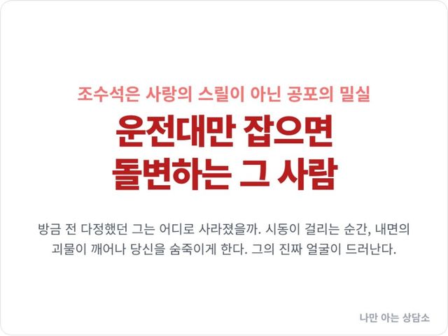 방금 전까지 식당에서 다정하게 웃던 사람이었다. 차 문을 열고 매너 좋게 당신을 태울 때까지만 해도 그는 세상에서 가장 완벽한 연인처럼 보였다. 하지만 시동이 걸리고 핸들을 잡는 순간, 공기의 흐름이 바뀐다.