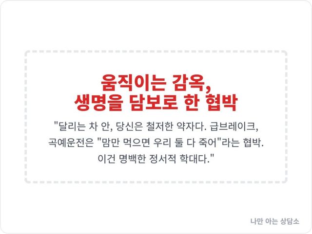 가정폭력 상담 사례를 보면, 신체적 폭력이 발생하기 전 단계에서 난폭 운전으로 공포심을 조장하는 경우가 매우 빈번하다. 밀폐된 공간에서 당신이 공포에 질려 떠는 모습을 보며 그들은 비뚤어진 통제감을 느낀다.