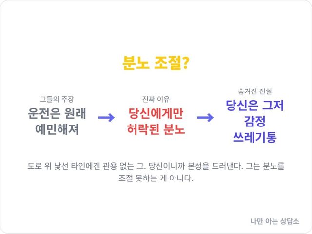 “아, 저 XX가 운전을 X같이 하잖아.” 그는 거친 숨을 몰아쉬며 자신의 분노를 정당화한다. 당신이 놀란 가슴을 쓸어내리며 “조금만 천천히 가자”라고 말해보지만, 그는 오히려 당신에게 화를 낸다. “지금 내 편 안 들고 저 사람 편드는 거야?”