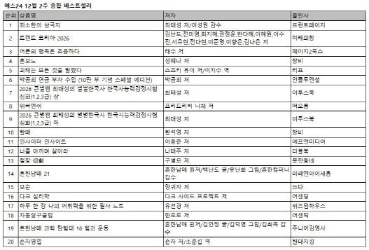 연말을 맞아 경제경영서의 강세도 두드러졌다. ‘트렌드 코리아 2026’(2위)을 비롯해 10만 부 돌파 기념 특별판 ‘박곰희 연금 부자 수업 (10만 부 기념 스페셜 에디션)’(6위), 투자 신간 ‘인사이더 인사이트’(11위) 등이 주목받았다. 특히 ‘인사이더 인사이트’는 재테크 관심이 높은 3040 남성 독자층(57.3%)의 강한 지지를 얻은 것으로 나타났다.