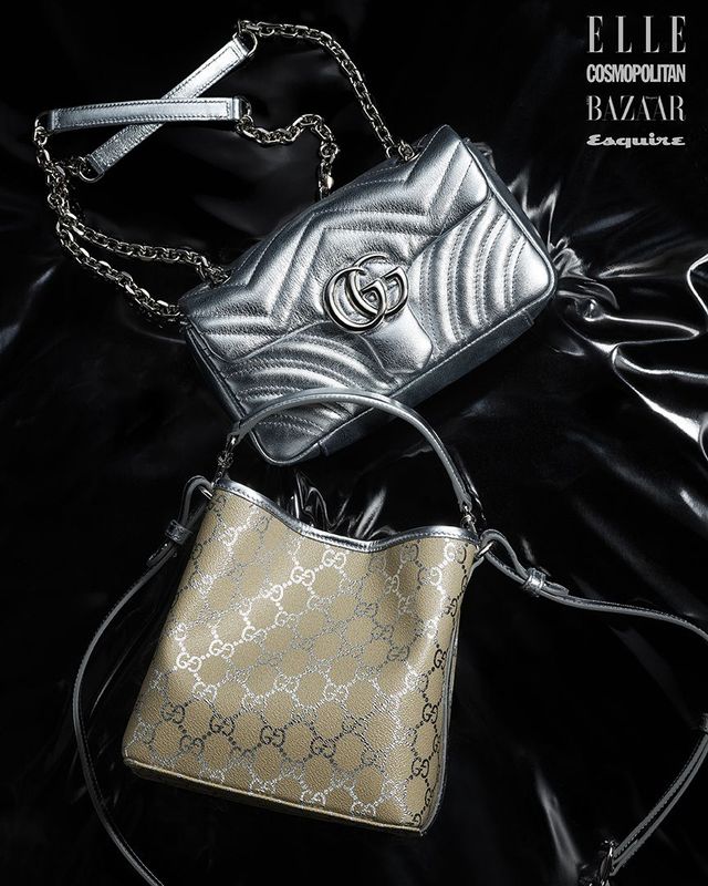 연말 시즌을 더욱 빛내줄 반짝이는 아이템. 더블 로고 디테일의 GG 마몽 미디엄 숄더백은 4백40만원, 레더 트리밍 장식이 돋보이는 GG 엠블럼 스몰 버킷백은 2백65만원 모두 Gucci.