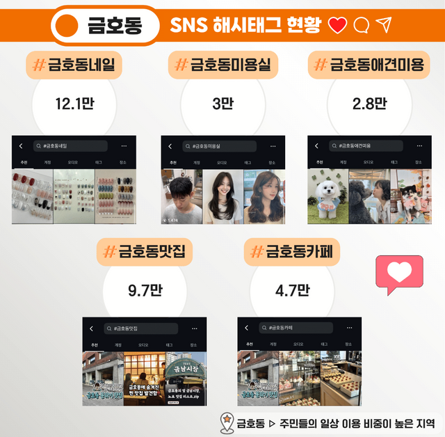 이러한 생활 기반은 SNS에서도 확인된다. 인스타그램 해시태그 분석 결과 #금호동네일 12만1000건, #금호동미용실 3만건, #금호동애견미용 2만8000건 등 주민 일상 중심의 콘텐츠가 높은 비중을 차지했다. #금호동맛집(9만7000건), #금호동카페(4만7000건) 역시 지역 내 일상 소비가 활발함을 보여주며 금호동이 외지인보다 주민 중심의 생활 밀착형 동네라는 점을 뒷받침한다.