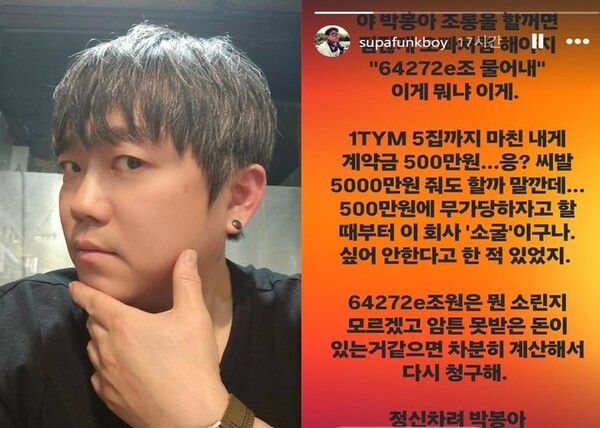 그룹 '원타임'(1TYM) 출신 송백경이 가수 박봄을 언급하며 YG엔터테인먼트와 양현석 총괄 프로듀서를 겨냥한 불만을 드러냈다.