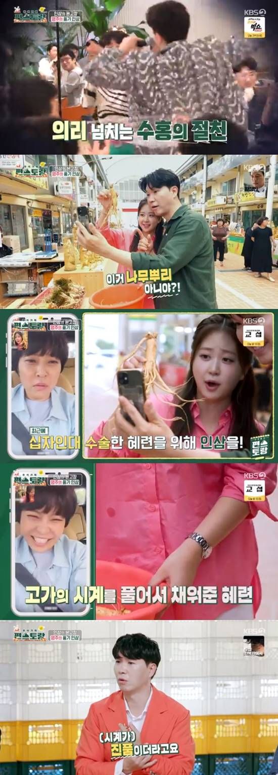 이어 김다예는 "최근에 수술도 하셨고 몸보신도 하셔야 하니까"라며 인삼을 선물해 주고 싶은 의사를 표했다. 조혜련은 "영주까지 갔는데 나를 생각한다는 게 감동이다"라며 되려 고마워했다.
