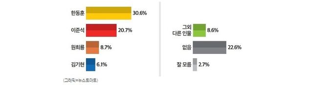 온라인 매체 <뉴스토마토>가 ‘미디어토마토’에 의뢰해 지난 25일부터 26일까지 이틀간 전국의 만 18세 이상 남녀 1013명을 대상으로 실시해 28일 발표한 ‘111차 여론조사’ 결과에 따르면, 한동훈 30.6%, 이준석 전 대표 20.7%, 원희룡 국토교통부 장관 8.7%, 김기현 대표 6.1%로 각각 집계됐다.