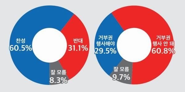 지역별로도 TK를 제외한 전 지역서 찬성 응답이 높게 나타났다. 보수진영의 강세지역인 부산·울산·경남(PK)서조차 절반 이상이 찬성했으며 ‘민심의 풍향계’로 읽히는 중도층서도 60% 이상이 찬성했다.