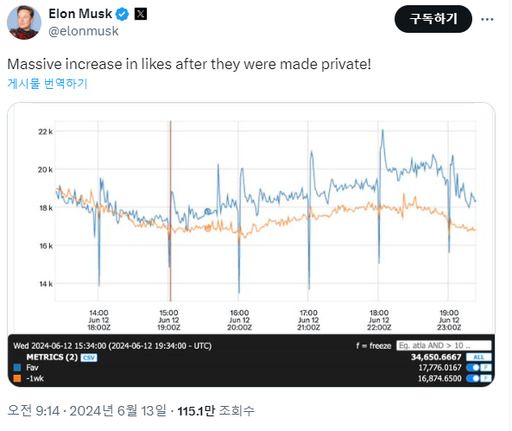 13일 일론 머스크 테슬라 CEO는 자신의 SNS 계정을 통해 "‘좋아요’를 비공개로 만들었더니 사람들의 클릭 횟수가 엄청나게 늘어났다"며 전날 엑스에서 기록된 ‘좋아요’ 기록을 공개했다.